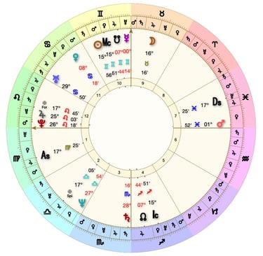 A word about my approach. This photograph speaks to a line from the ancient text The Emerald Tablet of Hermes Trismegistus, "That which is above is like to that which is below, and that which is below is like to that which is above,” I belong to the school of thought that sees the cosmos as reflective, not causative, of our experience. When we are able to see those interrelated, reflective systems at work, graphically displayed in a two-dimensional chart, we are able to better understand the parts of our lives and our psyche in play. We begin to see the patterns we may have felt our entire lives, but often below the level of awareness. By bringing awareness to these patterns, as well as to how they are woven into the ever-shifting cosmic tides, we can begin to change those habits and attitudes we feel no longer serve us.